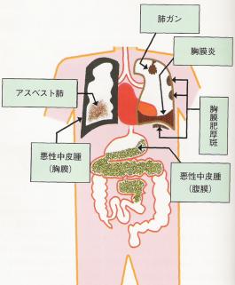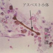 セキとタンも、アスベスト肺でよく起きる症状です。最初は、風邪が治りにくいと感じ始め、徐々に冬になるとセキとタンが出るようになり、そのうち一年中出るようになります。 昔から毎朝タンが出るのが当たり前と思っている方がいますが、「年のせい」だけでタンは出ません。しかしセキやタンは薬で治りますし、早期の治療で気管支炎や肺炎を軽くすれば息切れの進行をくい止められます。毎年定期健診を受け、特にセキやタンが出る人は必ず医療機関にかかって下さい。 なお、レントゲン写真、呼吸機能やタンの検査の結果に基づいて、労災補償が受けられることがあります。 ■悪性中皮腫 悪性中皮腫というのは、肺を包んでいる胸膜(肋膜)、腹部を包んでいる腹膜にできたガンの一種です。その膜を中皮というのでこの名があります。 もともと非常にめずらしい病気でしたが、近年非常に増加しています。原因はアスベストと考えてまず間違いありません。この病気の多くは労災補償が受けられます。 洗濯物からも?! 悪性胸膜中皮腫で亡くなった方の中には、女性で、仕事の上で全くアスベストを取り扱ったことがない人もいます。実は夫が造船所で働いていて、30年間家で夫の作業着の洗濯をしていたというのです。アメリカでも同じようなことが報告されています。
