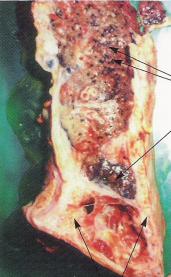 アスベストをたくさん吸った人は胸膜肥厚斑(きょうまくひこうはん)という、陶器のような白くてかなり固いものが、肋骨や横隔膜などに沿ってできます。アスベストを吸った証拠のようなもので、レントゲンではうつらなくても解剖すると見つかり、造船所の労働者の多くに見られます。 症状もなく、治療する必要はありませんが、他の病気が起こりやすくなるので、定期的にレントゲンを撮って下さい。なお胸膜肥厚斑だけでは労災の対象にはなりません。 ■胸膜炎 肺を包む胸膜(肋膜)に胸水がたまり、数カ月して自然に消失し、また少しして同じ側や別の側にくり返し胸膜炎を起こすものです。結核性でも肺ガンや中皮腫によるものでもなく、アスベスト自体によるものとされ、経過を見ないと診断がつきません。徐々に息切れが進行していき、治療が難しいのが現状です。典型例は労災になる可能性があります。 4.健康診断は正しく受けていますか? アスベストの病気は、それを吸って数十年後に、しばしば突如現われます。それを早期に発見するためにも健康診断は正しく受けなければなりません。 レントゲンは直接撮影で 粉じん職場で働く人に会社は、レントゲンの直接撮影をしなければならず、またレントゲンで異常があれば肺機能検査などの「じん肺健診」を受けさせなければなりません。その結果がたとえ[管理1]であっても、きちんと労働者に通知しなければなりません(じん肺法)。 間接撮影では写真が小さく初期のじん肺の診断は困難であり、しかも直接撮影より被ばくが多いとされています。 退職後も健康診断を アスベストによる病気は退職後に起きることが少なくありません。私達は年2〜3回の健康診断を勧めてきました。最低年に1回は、じん肺のチェックができる胸部レントゲン写真や肺活量などの呼吸機能、かくタン検査などの健康診断を受けましょう。 5.造船の街からの警鐘 1994年、横須賀のある造船所に1947〜71年の25年間にボイラーや断熱の職に半年以上就いていた190人の退職者を疫学調査をしました。 死亡原因 疫学調査の対象190名中、亡くなった方97名の死亡診断書による。 15%がアスベストで死亡 この疫学調査で対象となる190名を追跡したところ、すでに97名の方が亡くなっていました。死亡の原因は、97名中10名が肺ガン、3名がアスベスト肺、1名が悪性胸膜中皮腫でした。実に約15%がアスベストによる死亡だったのです。 死亡する割合を一般と比較すると、肺ガンで2倍以上、悪性中皮腫は34倍、じん肺も55倍にのぼることが分かりました。アスベストを多く吸った、わずか190人の方を対象にした調査でこの結果です。 医師からじん肺と告げられた 疫学調査の対象190名申、アンケートに答えた生存者71名による。 60%がじん肺 一方、アンケートに答えた71名の生存者のうち、医師からじん肺があると告げられた人は60%を占めました。じん肺が発病するのは、やはり大体60才前後でした。 80才で発症した人もいました。さあこれからゆっくりできると思った頃、みなさん病気になっているのです。 このような調査だけでは、死亡したときの病気しか考えないので、じん肺で長年苦しんでも心臓病で亡くなる人もいるし、本当の被害の実像は分かりません。そこで私たちが行なった病理調査の結果を見てみましょう。 肺組織を調査 造船所で勤務中あるいは退職後、亡くなった方72名の肺組織を調べた病理所見。 病理所見では86%がアスベスト関連 長年造船所に勤務して、勤務中あるいは退職後に亡くなった方72名の肺の組織を顕微鏡で調べた結果、全く所見のない人はわずか10人(14%)でした。アスベストに関連する痛気がある人は62人(86%)もおり、中には重複した所見のある人もいました。病理学的診断では、さらに多くの被害を明らかにすることができたのです。 最盛期には全国で30万人を越えた造船所労働者の、退職後の健康が気がかりです。