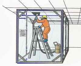 粉じんをブロアーで吹き飛ばしてきれいにしたつもりが、実はかえってまき散らし、多くの労働者をアスベスト被害に巻き込んでいます。中途半端な対策では逆効果です。 隔離が原則 工場内では上の図のような粉じん作業の部屋を設け、そこに局所排気装置をつけ十分な性能を保ちます。 船内の場合は構造が複雑で、隔離は簡単ではありませんが、新造船なら配管などの早期儀装の装着箇所を一定にすることで解決できます。 休日に 修理船などで場所を限定するのが困難な場合には、粉じん作業と他の作業の時間をずらします。 イギリスヤアメリカで広まっている、修理船でのアスベスト除去作業の、一つの原則は「大規模な除去作業は、週末や休日になるように、作業計画部薯が調整する」というものです。