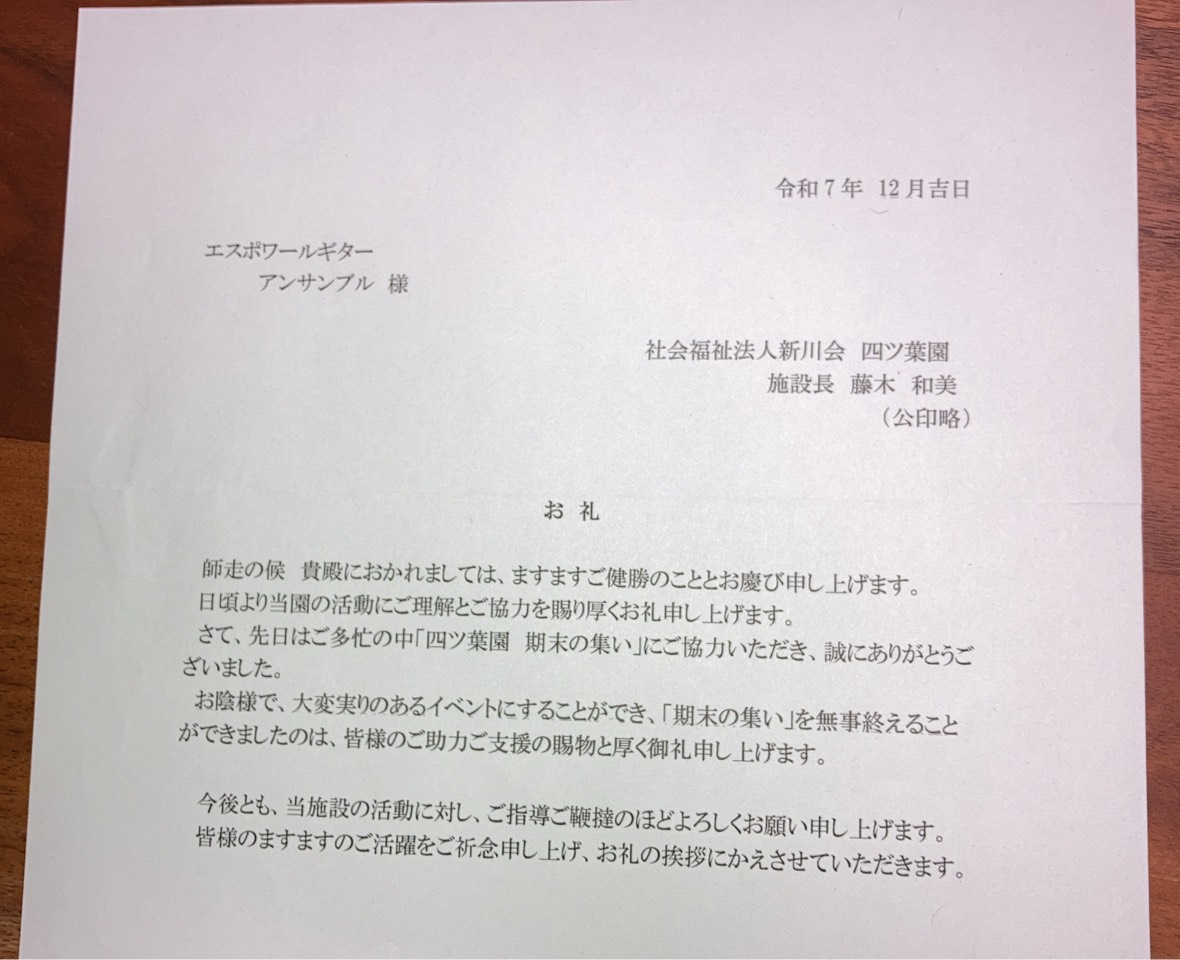 ・2026年1月15日 昨年12月23日に演奏会を開催させて頂いた「四つ葉園」施設長の藤木様からお礼状をいただきました。これからの練習の励みになります。ありがとうございました。