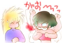 | ルーティは ひたすら 怒っていた 「なんでだ〜っ!!!」 「それは リオン本人が 1番 思ってることだって」 | |